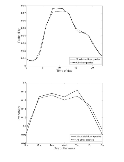 With the study showing there is a strong relationship between searches for mood-stabilising drugs (MSD) and the development of manic or depressive episodes at specific times, we have a clue of a possible correlation. Analyses revealed that the MSD users, who probably were prescribed these medications, displayed signs of having searched most in the morning (when the most common mood disorder complications take place) and on weekdays (reflecting the structure of a working routine). The diagram in Figure 1 clearly illustrates that the MSD queries follow this cyclic behaviour: they peak in the morning and on weekdays, which is just as expected with the common trend in depression disorders.