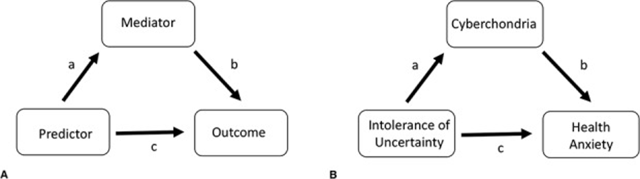 Figure 3: (A) The mediation analysis is shown in this figure. (B) This diagram illustrates how health anxiety is the result, Cyberchondria is the mediator, and intolerance of ambiguity is the predictor. Along with these effects, This graphic also shows the direct effect (Path c: intolerance of uncertainty on health anxiety that did not result in Cyberchondria), the indirect influence (Path a × b), and the effect of Cyberchondria on health anxiety.