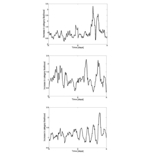 Figure 2: changes over time in the likelihood of a specific query category. An MSD query time of zero marks. Starting at the top, the categories represented are adult materials, business, and nutrition. The five-hour moving average was used to smooth the time data. (Yom-Tov et al., 2014)